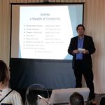 CCC member John Clough was the MC and David Keltner from Hacker gave a riveting presentation about the New JACC, its history, our plans and the design for the new Center. Everyone sampled smoked king salmon thanks to Bonny Millard, Alaskan Amber thanks to Dave Hunsaker and Emily Laskin, and Candied Smoked Salmon ice cream and Rhubarb Sorbet, thanks to Marc Wheeler at Coppa. Everyone left with a deck of Trickster playing cards, thanks to Rico Worl.