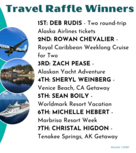 CommunityTravel Raffle winners!Posted by Nancy on November 27, 2023Thank you! One of our most successful raffles ever! Thank you to everyone for their support and encouragement!